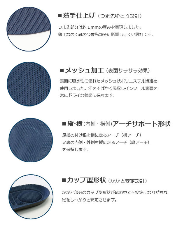 汗をすばやく吸収し、インソール表面を常にドライな状態に保ちます。