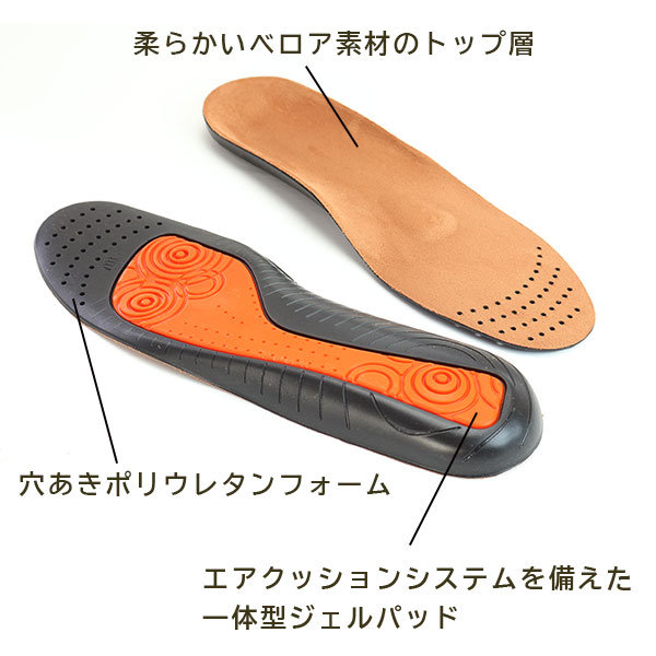 ○特殊な衝撃吸収エアチャンバーシステムを備えたソフトジェルパッドが圧力を軽減し、歩行時の衝撃を吸収します。